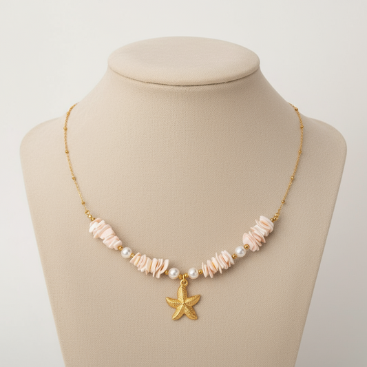 Collar de Concha, Estrella de Mar y Perla Dorado para Mujer en Acero Inoxidable | Vanytel