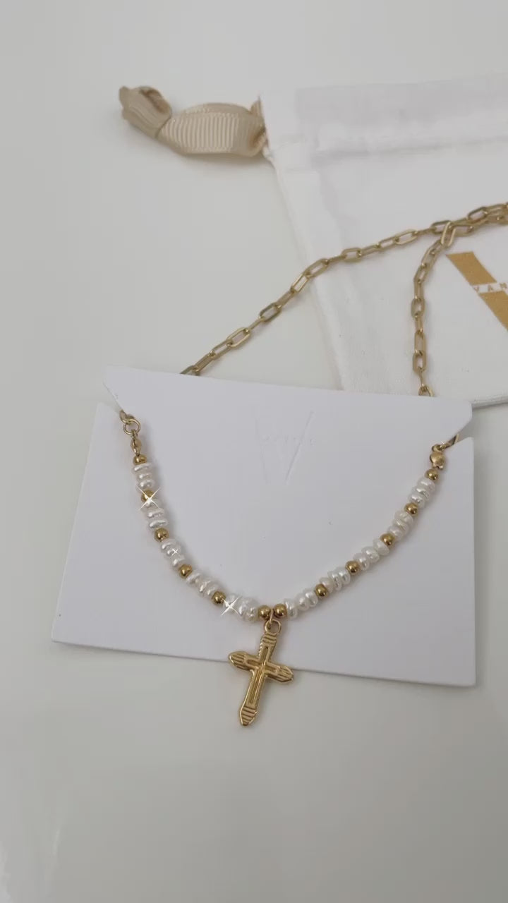 Collar Crucecita con Perlas y Dije de Cruz Dorado en Acero Inoxidable – Mujer | Vanytel